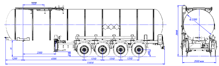 Ходовая часть полуприцепа четырехосная односкатная производства «BPW» (Германия), гарантия предоставляется фирмой «BPW» до 3 лет. Двухпроводная тормозная система, оснащенная системой 2S/2M с функцией ABS. Полуприцеп SF4B30.1S_07 оборудован крыльями из ПВХ. Цистерна подвергается специальной обработки с предварительной грунтовкой, обогащенной цинком и окрашиванием в один цвет высококачественной двухкомпонентной краской. Высота седельно-сцепного устройства 1150-1250 мм. Общая длина 11,5 м. Высота 3,65 м. Ширина 2,55 м.