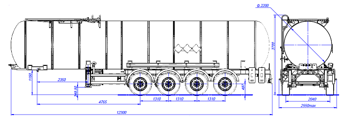 Ходовая часть полуприцепа четырехосная односкатная производства «BPW» (Германия), гарантия предоставляется фирмой «BPW» до 3 лет. Двухпроводная тормозная система, оснащенная системой 2S/2M с функцией ABS. Полуприцеп оборудован крыльями из ПВХ. Цистерна подвергается специальной обработки с предварительной грунтовкой, обогащенной цинком и окрашиванием в один цвет высококачественной двухкомпонентной краской. Высота седельно-сцепного устройства 1150-1250 мм. Первая и четвертая оси подъемные.
