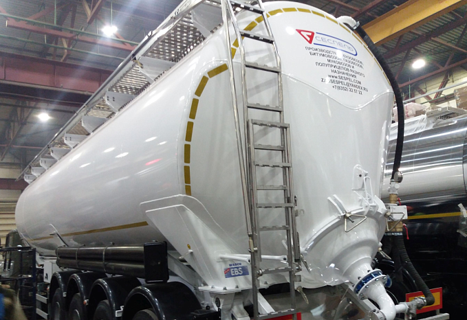 Двухпроводная тормозная система, оснащенная системой 2S/2M с функцией ABS. 4-х осный полуприцеп SB4U53 оборудован индивидуальными крыльями из ПВХ. Цистерна подвергается специальной обработки с предварительной грунтовкой, обогащенной цинком и окрашиванием в один цвет высококачественной двухкомпонентной краской. Высота седельно-сцепного устройства от 1150 до 1350 мм.
