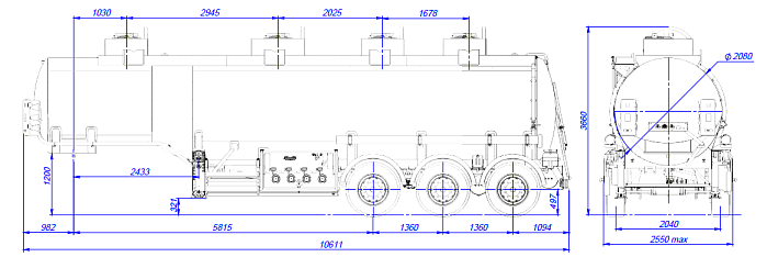 - Общая вместительность составляет 32 м3, с разделением на четыре отсека с объемами 8,2 м3/ 10 м3/ 4,7 м3/ 9,1 м3.