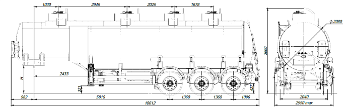 - Общая вместительность составляет 32 м3, с разделением на четыре отсека с объемами 8,2 м3/ 10,1 м3/ 4,6 м3/ 9,1 м3.