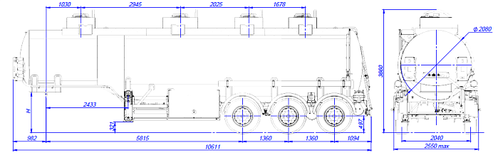 - Общая вместительность составляет 32 м3, с разделением на четыре отсека с объемами 8,2 м3/ 10,1 м3/ 4,6 м3/ 9,1 м3.