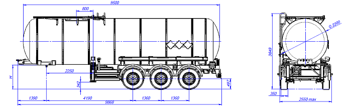 Битумовоз 96487S ССУ 1150, 1 отсек_31 - это весьма узкоспециализированная автоцистерна, которая предназначена для перевозки и временного хранения битума, мазута, сырой нефти, а также некоторых других веществ, разогретых до температуры 200 градусов. Конструкция цистерны выполнена из низколегированной стали. Объем цистерны составляет 25 м3. Битумовоз 96487S разделяется на 1 отсек. Транспортируется тягачом колесной формулой 6х4 российского или иностранного производства. Общая длина транспортного средства 10 м. Высота 4 м. Ширина 2,55 м. Колесная база 4190+1360+1360 мм. Грузоподъемность 21850 кг.