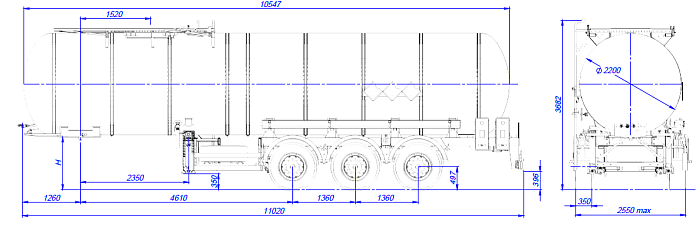 - Конструкция цистерны выполнена из низколегированной стали, либо из нержавеющей стали, самонесущей конструкции, предназначенная для перевозки и временного хранения темных нефтепродуктов (горячий битум, смолистые масла, мазут и пр.), транспортируется тягачом колесной формулой , 6х4 российского или иностранного производства;