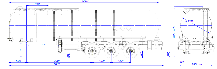 Грузоподъемность 24300 кг. Нагрузка на оси 22459 кг. Нагрузка ССУ 9541 кг. Рабочая температура транспортируемого в цистерне битума составляет около 250°C. Гравитационный слив через донный клапан и заслонку Ду-100 (4"). Материал: Сталь 09Г2С, толщина стенки и днищ не менее: 4,00 мм. Цистерна имеет 1 отсек с волнорезами. Отсек оснащен горловым кольцом и люком лазом с соответствующей крышкой и донной прокладкой. Конструктивно предусмотрена возможность наполнения цистерны на 85% от номинального объема (один мерный уголок установлен внутри цистерны на номинальный объем, второй уголок установлен на 95% от номинального объема цистерны).