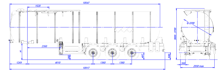 Конструкция цистерны SF3B28_1S_07, ССУ 1250, 1 отсек выполнена из низколегированной стали, либо из нержавеющей стали, самонесущей конструкции, предназначенная для перевозки и временного хранения темных нефтепродуктов (горячий битум, смолистые масла, мазут и пр.), транспортируется тягачом колесной формулой, 6х4 российского или иностранного производства. Корпус цистерны изготовлен из низколегированной стали и покрыт тепловой изоляцией (дополнительная опция) 150 мм, а также листом оцинкованной стали толщиной 0,8 мм либо из нержавеющей стали толщиной 0,8 мм. Модель: круглая форма, с заниженным центром тяжести. Общая длина 11050 мм. Высота 3650 мм. Ширина 2550 мм.