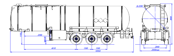 Конструкция цистерны SF3B28_1S_44, ССУ 1250, 1 отсек выполнена из низколегированной стали, либо из нержавеющей стали, самонесущей конструкции, предназначенная для перевозки и временного хранения темных нефтепродуктов (горячий битум, смолистые масла, мазут и пр.), транспортируется тягачом колесной формулой, 6х4 российского или иностранного производства. Общая масса брутто 32000 кг. Грузоподъемность 24300 кг. Корпус цистерны изготовлен из низколегированной стали и покрыт тепловой изоляцией (дополнительная опция) 150 мм, а также листом оцинкованной стали толщиной 0,8 мм либо из нержавеющей стали толщиной 0,8 мм. Модель: круглая форма, с заниженным центром тяжести. Высота ТС 3650 мм. Ширина 2550 мм. Нагрузка ССУ 9541 кг. Нагрузка на оси 22459 кг.