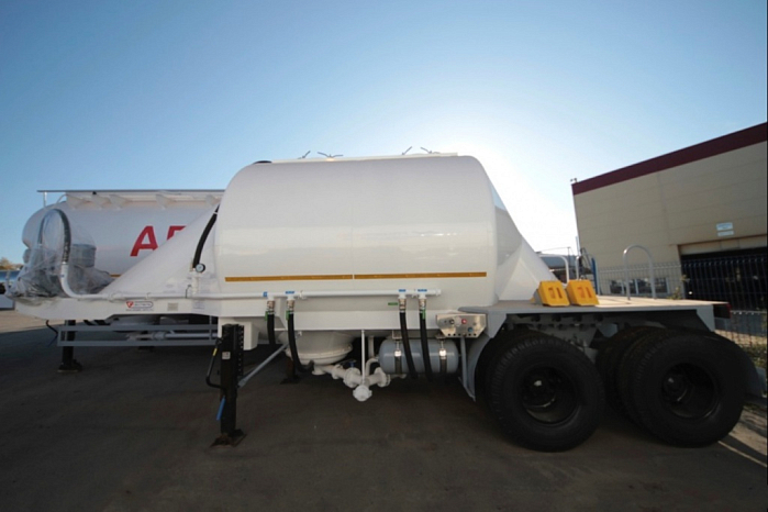 Конструкция цистерны выполнена из низколегированной стали в виде несущей емкости. В зависимости от модели полуприцеп может состоять из 1-3 отсека. Коллектор для разгрузки расположен выше уровня осей, с левой стороны сосуда, между опорным устройством и передней осью тележки. Система пневматической разгрузки с аэроднищем из ткани FLUITEX E800/5 (Германия) в каждом конусе. Верхняя загрузка осуществляется через люки крышек горловин.