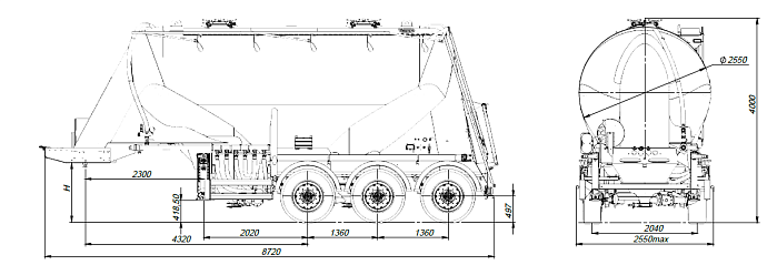 Цементовоз разделяется на 2 отсека. Транспортируется тягачом колесной формулой – 4х2 российского или иностранного производства. Ходовая часть полуприцепа трехосная односкатная с пневмоподвеской производства «BPW» (Германия), гарантия предоставляется фирмой «BPW» до 3 лет. Двухпроводная тормозная система, оснащенная системой 2S/2M с функцией ABS. Полуприцеп оборудован индивидуальными крыльями из ПВХ.