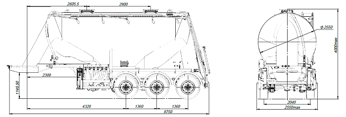 Цементовоз разделяется на 2 отсека. Транспортируется тягачом колесной формулой – 4х2 российского или иностранного производства. Ходовая часть полуприцепа трехосная односкатная с пневмоподвеской производства «BPW» (Германия), гарантия предоставляется фирмой «BPW» до 3 лет. Двухпроводная тормозная система, оснащенная системой 2S/2M с функцией ABS. Полуприцеп оборудован индивидуальными крыльями из ПВХ.