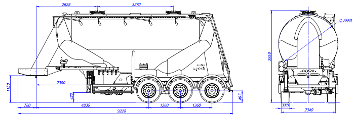 Количество изолированных отсеков – 1 (емкость может быть разделена внутренними перегородками на 4 (четыре) герметичных отсека для перевозки различных сортов груза с индивидуальной выгрузкой). Ходовая часть полуприцепа трехосная односкатная с пневмоподвеской производства «BPW» (Германия), гарантия предоставляется фирмой «BPW» до 3 лет. Двухпроводная тормозная система, оснащенная системой 2S/2M с функцией ABS. Полуприцеп оборудован индивидуальными крыльями из ПВХ.