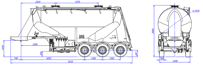 Количество изолированных отсеков – 1 (емкость может быть разделена внутренними перегородками на 4 (четыре) герметичных отсека для перевозки различных сортов груза с индивидуальной выгрузкой). Ходовая часть полуприцепа трехосная односкатная с пневмоподвеской производства «BPW» (Германия), гарантия предоставляется фирмой «BPW» до 3 лет. Двухпроводная тормозная система, оснащенная системой 2S/2M с функцией ABS. Полуприцеп оборудован индивидуальными крыльями из ПВХ.