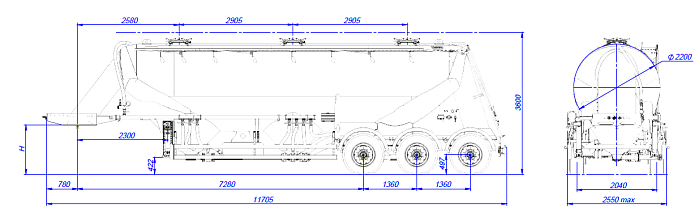 Количество изолированных отсеков – 1 (емкость может быть разделена внутренними перегородками на 4 (четыре) герметичных отсека для перевозки различных сортов груза с индивидуальной выгрузкой). Ходовая часть полуприцепа трехосная односкатная с пневмоподвеской производства «BPW» (Германия), гарантия предоставляется фирмой «BPW» до 3 лет. Двухпроводная тормозная система, оснащенная системой 2S/2M с функцией ABS. Полуприцеп оборудован индивидуальными крыльями из ПВХ.
