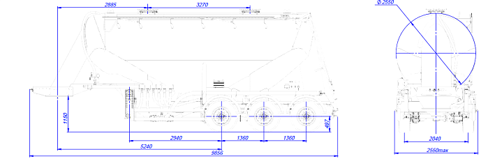 Количество изолированных отсеков – 1 (емкость может быть разделена внутренними перегородками на 4 (четыре) герметичных отсека для перевозки различных сортов груза с индивидуальной выгрузкой). Ходовая часть полуприцепа трехосная односкатная с пневмоподвеской производства «BPW» (Германия), гарантия предоставляется фирмой «BPW» до 3 лет. Двухпроводная тормозная система, оснащенная системой 2S/2M с функцией ABS. Полуприцеп оборудован индивидуальными крыльями из ПВХ.