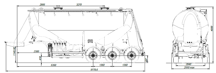 Цементовоз SF3U32_1A_09 - полуприцеп-цистерна, предназначенная для перевозки цемента, а также других строительных смесей. Помимо строительной направленности, полуприцеп может использоваться для перевозки сыпучих пищевых продуктов (зерна, крупы, муки и т.п.). Конструкция цистерны выполнена из алюминиевого сплава. Объем цистерны составляет 32,5 м3. Транспортируется тягачом колесной формулой – 4х2 российского или иностранного производства. Общая длина составляет 8,750 м. Колесная база 5,35+1,36+1,36 м.