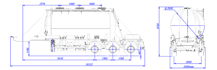 Количество изолированных отсеков – 1 (емкость может быть разделена внутренними перегородками на герметичные отсеки для перевозки различных сортов груза с индивидуальной выгрузкой. Ходовая часть полуприцепа трехосная односкатная с пневмоподвеской производства «BPW» (Германия), гарантия предоставляется фирмой «BPW» до 3 лет. Двухпроводная тормозная система, оснащенная системой 2S/2M с функцией ABS. Полуприцеп SF3U25_1S_01 оборудован индивидуальными крыльями из ПВХ.