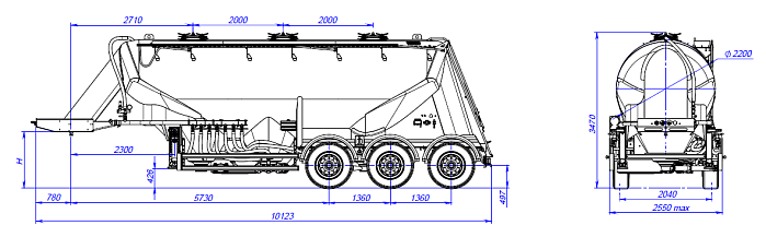 Цементовоз 964822_00 - полуприцеп-цистерна, предназначенная для перевозки цемента, а также других строительных смесей. Помимо строительной направленности, полуприцеп может использоваться для перевозки сыпучих пищевых продуктов (зерна, крупы, муки и т.п.). Конструкция цистерны выполнена из алюминиевого сплава. Объем цистерны составляет 24 м3. Транспортируется тягачом колесной формулой – 4х2 российского или иностранного производства. Грузоподъемность 31464 кг.