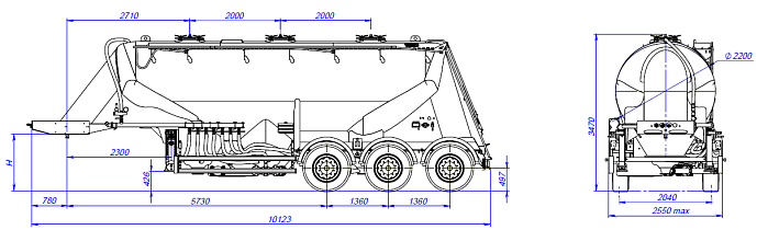 Цистерна подвергается специальной обработки с предварительной грунтовкой, обогащенной цинком и окрашиванием в один цвет высококачественной двухкомпонентной краской. Выгрузка цемента из цементовоза производится посредством сжатого воздуха, поэтому автомобильные цистерны обязательно должны оснащаться компрессором, либо место выгрузки должно быть оборудовано стационарной компрессорной станцией. Загрузка осуществляется через верхние люки. Высота седельно-сцепного устройства от 1250 до 1350 мм. Грузоподъемность 26350 кг. Общая масса брутто 32000 кг.