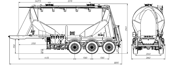 Загрузка цементовоза осуществляется через верхние люки. Коллектор для разгрузки расположен выше уровня осей, с левой стороны сосуда, между опорным устройством и передней осью тележки.