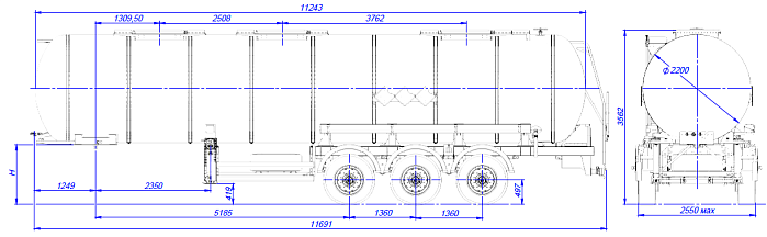 Двухпроводная тормозная система, оснащенная системой 2S/2M с функцией ABS. Полуприцеп оборудован индивидуальными крыльями из ПВХ. Цистерна подвергается специальной обработки с предварительной грунтовкой, обогащенной цинком и окрашиванием в один цвет высококачественной двухкомпонентной краской. Высота седельно-сцепного устройства 1200-1300 мм.