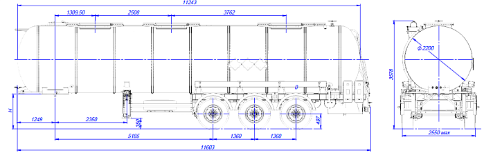 Двухпроводная тормозная система, оснащенная системой 2S/2M с функцией ABS. Габариты ТС 11,9х3,6х2,55 м. Грузоподъемность 24050 кг. Масса снаряжённого ТС 7950 кг. Расположение технологического ящика сзади. Полуприцеп оборудован индивидуальными крыльями из ПВХ. Цистерна подвергается специальной обработки с предварительной грунтовкой, обогащенной цинком и окрашиванием в один цвет высококачественной двухкомпонентной краской. Высота седельно-сцепного устройства 1150-1250 мм.