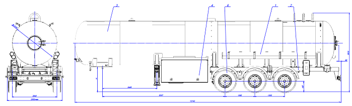 Газовоз 964884 ССУ 1150, 1 отсек_05 изготавливается в виде полуприцепа-цистерны, а также автоцистерны на шасси, предназначен для перевозки,заправки и временного хранения газа: пропана,бутана (СУГ). Объем цистерны изготавливаемой техники составляет 36100 л. Габариты техники 12,3х4х2,55 м. Расстояние между осями 1,36 м. Высота ССУ 1,25 м.