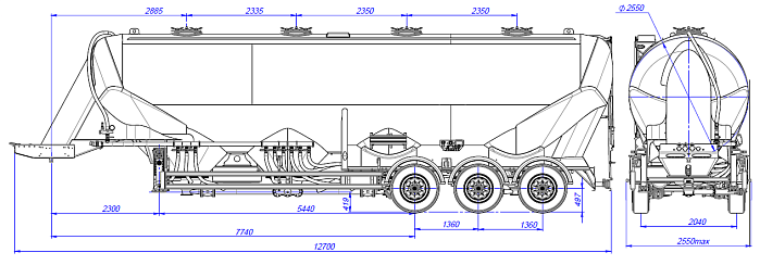 Муковоз SF3U55_2A_02 55м3, 2 отсека, ССУ 1250 - это полуприцеп-цистерна, предназначенная для бестарной перевозки сыпучей пищевой продукции (зерновых культур, муки, отрубей, комбикорма, сахара, кормов, гранул и др.). Конструкция цистерны выполнена из алюминиевого сплава (Германия) в виде несущей емкости. Объем цистерны составляет 55 м3. Муковоз разделяется на 2 отсека. Транспортируется SF3U55_2A_02 тягачом колесной формулой – 4х2 российского или иностранного производства. Количество изолированных отсеков – 1 (емкость может быть разделена внутренними перегородками на 5 (пять) герметичных отсека для перевозки различных сортов груза с индивидуальной выгрузкой. Общая длина 12710 мм. Высота 4 метра. Ширина 2,55 метра. Колеса 385/65R22,5; 6+1. Разгрузочный узел расположен слева.