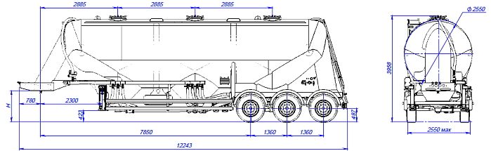 Муковоз SF3U48_3A_06 ССУ 1150, 3 отсека - это полуприцеп-цистерна, предназначенная для бестарной перевозки сыпучей пищевой продукции (зерновых культур, муки, отрубей, комбикорма, сахара, кормов, гранул и др.). Конструкция цистерны выполнена из алюминиевого сплава (Германия) в виде несущей емкости. Объем цистерны составляет 45,5 м3. Муковоз SF3U48_3A_06 разделяется на 3 отсека. Транспортируется тягачом колесной формулой – 4х2 российского или иностранного производства. Количество изолированных отсеков – 1 (емкость может быть разделена внутренними перегородками на 5 (пять) герметичных отсека для перевозки различных сортов груза с индивидуальной выгрузкой. Расстояние между осями 1360 мм. Колеса 385/65R22,5; 6+1. Общая масса 34950 кг. Нагрузка ССУ 12050 кг.