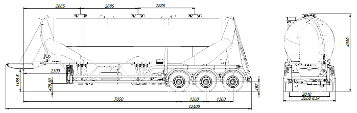 Муковоз SF3U48_3A_20 ССУ 1150, 3 отсека - это полуприцеп-цистерна, предназначенная для бестарной перевозки сыпучей пищевой продукции (зерновых культур, муки, отрубей, комбикорма, сахара, кормов, гранул и др.). Конструкция цистерны выполнена из алюминиевого сплава (Германия) в виде несущей емкости. Объем цистерны составляет 45,5 м3. Муковоз SF3U48_3A_20 разделяется на 3 отсека. Транспортируется тягачом колесной формулой – 4х2 российского или иностранного производства. Количество изолированных отсеков – 1 (емкость может быть разделена внутренними перегородками на 5 (пять) герметичных отсека для перевозки различных сортов груза с индивидуальной выгрузкой. Расстояние между осями 1360 мм. Колеса 385/65R22,5; 6+1. Общая масса 34650 кг. Нагрузка ССУ 12200 кг.