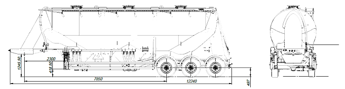 Муковоз SF3U48_3A_22 ССУ 1250, 3 отсека - это полуприцеп-цистерна, предназначенная для бестарной перевозки сыпучей пищевой продукции (зерновых культур, муки, отрубей, комбикорма, сахара, кормов, гранул и др.). Конструкция цистерны выполнена из алюминиевого сплава (Германия) в виде несущей емкости. Объем цистерны составляет 45,5 м3. Муковоз SF3U48_3A_22 разделяется на 3 отсека. Транспортируется тягачом колесной формулой – 4х2 российского или иностранного производства. Количество изолированных отсеков – 1 (емкость может быть разделена внутренними перегородками на 5 (пять) герметичных отсека для перевозки различных сортов груза с индивидуальной выгрузкой. Расстояние между осями 1360 мм. Колеса 385/65R22,5; 6+1. Общая масса 32600 кг. Нагрузка ССУ 10100 кг.