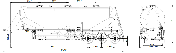 Муковоз SF3U48_3A_26 ССУ 1350, 3 отсека - это полуприцеп-цистерна, предназначенная для бестарной перевозки сыпучей пищевой продукции (зерновых культур, муки, отрубей, комбикорма, сахара, кормов, гранул и др.). Конструкция цистерны выполнена из алюминиевого сплава (Германия) в виде несущей емкости. Объем цистерны составляет 45,5 м3. Муковоз SF3U48_3A_26 разделяется на 3 отсека. Транспортируется тягачом колесной формулой – 4х2 российского или иностранного производства. Количество изолированных отсеков – 1 (емкость может быть разделена внутренними перегородками на 5 (пять) герметичных отсека для перевозки различных сортов груза с индивидуальной выгрузкой. Расстояние между осями 1360 мм. Колеса 385/65R22,5; 6+1. Общая масса 34650 кг. Нагрузка ССУ 12200 кг.