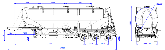 Муковоз SF3U48_3A_04 ССУ 1250, 3 отсека - это полуприцеп-цистерна, предназначенная для бестарной перевозки сыпучей пищевой продукции (зерновых культур, муки, отрубей, комбикорма, сахара, кормов, гранул и др.). Конструкция цистерны выполнена из алюминиевого сплава (Германия) в виде несущей емкости. Объем цистерны составляет 45,5 м3. Муковоз SF3U48_3A_04 разделяется на 3 отсека. Транспортируется тягачом колесной формулой – 4х2 российского или иностранного производства. Количество изолированных отсеков – 1 (емкость может быть разделена внутренними перегородками на 5 (пять) герметичных отсека для перевозки различных сортов груза с индивидуальной выгрузкой. Грузоподъемность 24550 кг. Высота ССУ 1250 мм. Масса снаряжённого ТС 6550 кг.