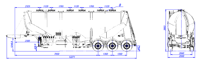 Муковоз SF3U48_4A_01 ССУ 1250, 4 отсека - это полуприцеп-цистерна, предназначенная для бестарной перевозки сыпучей пищевой продукции (зерновых культур, муки, отрубей, комбикорма, сахара, кормов, гранул и др.). Конструкция цистерны выполнена из алюминиевого сплава (Германия) в виде несущей емкости. Объем цистерны составляет 45,5 м3. Муковоз SF3U48_4A_01 разделяется на 4 отсека. Транспортируется тягачом колесной формулой – 4х2 российского или иностранного производства. Количество изолированных отсеков – 1 (емкость может быть разделена внутренними перегородками на 5 (пять) герметичных отсека для перевозки различных сортов груза с индивидуальной выгрузкой. Расстояние между осями 1360 мм. Колеса 385/65R22,5; 6+1. Общая масса 34700 кг. Нагрузка ССУ 12300 кг.