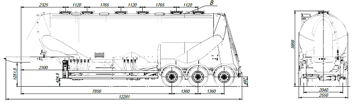 Муковоз SF3U48_4A_02 ССУ 1250, 4 отсека - это полуприцеп-цистерна, предназначенная для бестарной перевозки сыпучей пищевой продукции (зерновых культур, муки, отрубей, комбикорма, сахара, кормов, гранул и др.). Конструкция цистерны выполнена из алюминиевого сплава (Германия) в виде несущей емкости. Объем цистерны составляет 45,5 м3. Муковоз SF3U48_4A_02 разделяется на 4 отсека. Транспортируется тягачом колесной формулой – 4х2 российского или иностранного производства. Количество изолированных отсеков – 1 (емкость может быть разделена внутренними перегородками на 5 (пять) герметичных отсека для перевозки различных сортов груза с индивидуальной выгрузкой. Расстояние между осями 1360 мм. Колеса 385/65R22,5; 6+1. Общая масса 34700 кг. Нагрузка ССУ 12300 кг.