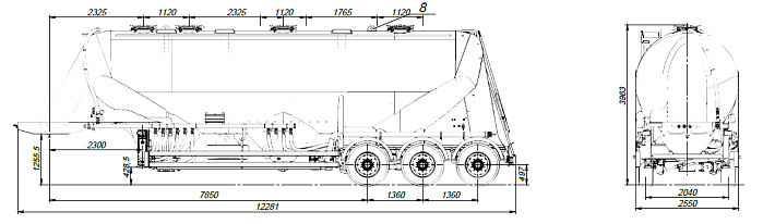 Муковоз SF3U48_4A_03 ССУ 1250, 4 отсека - это полуприцеп-цистерна, предназначенная для бестарной перевозки сыпучей пищевой продукции (зерновых культур, муки, отрубей, комбикорма, сахара, кормов, гранул и др.). Конструкция цистерны выполнена из алюминиевого сплава (Германия) в виде несущей емкости. Объем цистерны составляет 45,5 м3. Муковоз SF3U48_4A_03 разделяется на 4 отсека. Транспортируется тягачом колесной формулой – 4х2 российского или иностранного производства. Количество изолированных отсеков – 1 (емкость может быть разделена внутренними перегородками на 5 (пять) герметичных отсека для перевозки различных сортов груза с индивидуальной выгрузкой. Расстояние между осями 1360 мм. Колеса 385/65R22,5; 6+1. Общая масса 34700 кг. Нагрузка ССУ 12300 кг.