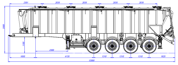 Объем цистерны составляет 28 м3. Грузоподъемность 25,5 тонн. Масса снаряжённого ТС 9750 кг. Материал сталь. Транспортируется тягачом колесной формулой – 4х2 российского или иностранного производства. Количество изолированных отсеков – 1. Ходовая часть полуприцепа четырехосная односкатная с пневмоподвеской производства «BPW» (Германия), гарантия предоставляется фирмой «BPW» до 3 лет. Двухпроводная тормозная система, оснащенная системой 2S/2M с функцией ABS. Полуприцеп оборудован индивидуальными крыльями из ПВХ. Цистерна подвергается специальной обработки с предварительной грунтовкой, обогащенной цинком и окрашиванием в один цвет высококачественной двухкомпонентной краской. Высота седельно-сцепного устройства от 1150 до 1250 мм. Цементовоз может быть оснащен вакуумной станцией для самозагрузки. Расстояние между осями 1310 мм.