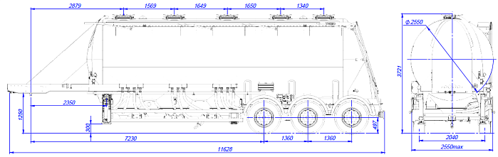 Муковоз SF3U41_1S_02 ССУ 1250, 1 отсек - это полуприцеп-цистерна, предназначенная для бестарной перевозки сыпучей пищевой продукции (зерновых культур, муки, отрубей, комбикорма, сахара, кормов, гранул и др.). Конструкция цистерны выполнена из низколегированной стали. Объем цистерны составляет 39,5. Муковоз разделяется на 1 отсек. Транспортируется тягачом колесной формулой – 4х2 российского или иностранного производства. Количество изолированных отсеков – 1 (емкость может быть разделена внутренними перегородками на 3 (Три) герметичных отсека для перевозки различных сортов груза с индивидуальной выгрузкой). Колесная база 7230+1360+1360. Расстояние между осями 1360 мм. Общая масса брутто 32150 кг. Грузоподъемность 22600 кг.
