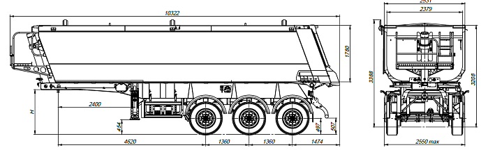Конструкция кузова DB3U34_1S_04, 34 м3, 1 отсек, ССУ 1250 выполнена из высокопрочной стали, полуприцеп с низкой собственной массой, предназначен для перевозки инертных грузов, транспортируется тягачом колесной формулой 6х4 российского или иностранного производства. Кузов прямоугольного сечения изготовлен из алюминиевых профилей с высокой стойкостью к износу толщиной от 20-40 мм, сваренные на станке СТП (сварка трением перемешиванием) . Верхний пояс выполнен в форме П-образного профиля, имеющего закругленные углы.Конструкция обеспечивает лучшее распределение статистических и динамических напряжений в местах концентрации с расчетом максимальной возможной нагрузки.