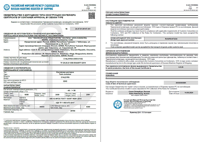 Контейнер-цистерна C14L21RS от ЗАО «Сеспель» удобен в первую очередь для сохранения безопасности транспортируемых грузов. Категория «для специальных грузов» также относится к морским контейнерам.