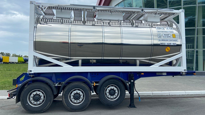Танк-контейнер транспортирует подобные грузы авто-, железнодорожным или морским способом. Данное средство для доставки определенного вида представляет собой морской контейнер T14, который оснащен стальным каркасом и алюминиевой цистерной, оборудованный сливной арматурой и приспособлениями для разгрузки товара под давлением. Объем цистерны составляет 21 м3. Грузоподъемность 36000 кг. Масса снаряжённого ТС 6300 кг.