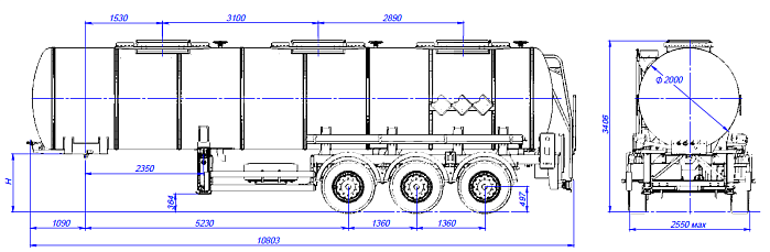 96487B_37 ССУ 1150, 1 отсек - цистерна для химической продукции. Предназначена для транспортирования и кратковременного хранения неорганических и органических, химически агрессивных и химически нейтральных жидкостей и т.д. Конструкция цистерны выполнена из нержавеющей стали. Объем цистерны составляет 25 м3. Полуприцеп 96487B_37 разделяется на 3 отсека. Транспортируется тягачом колесной формулой 4х2, 6х4 российского или иностранного производства. Ходовая часть полуприцепа трехосная односкатная с пневмоподвеской или рессорной (на выбор клиента) производства «BPW» (Германия), гарантия предоставляется фирмой «BPW» до 3 лет. Двухпроводная тормозная система, оснащенная системой 2S/2M с функцией ABS. Грузоподъемность 24,7 т. Нагрузка на оси 21250 кг.