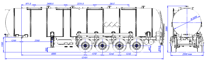 SF4932.4N_02, 32м3, 4 отсека, ССУ 1250 - это 4-х осный полуприцеп-цистерна , предназначенная для перевозки химических веществ относящихся к 9 классу - прочие опасные вещества. Конструкция цистерны выполнена из нержавеющей стали и покрыт тепловой изоляцией. Объем цистерны составляет 32 м3. Транспортируется тягачом колесной формулой – 4х2 российского или иностранного производства. Один изолированный отсек. Грузоподъемность не более 26500 м3. Ходовая часть полуприцепа SF4932 четырехосная односкатная с пневмоподвеской производства «BPW» (Германия), гарантия предоставляется фирмой «BPW» до 3 лет. Габариты 12,2х3,6х2,55 метров. Колесная база 4885+1310+1310+1310 мм.
